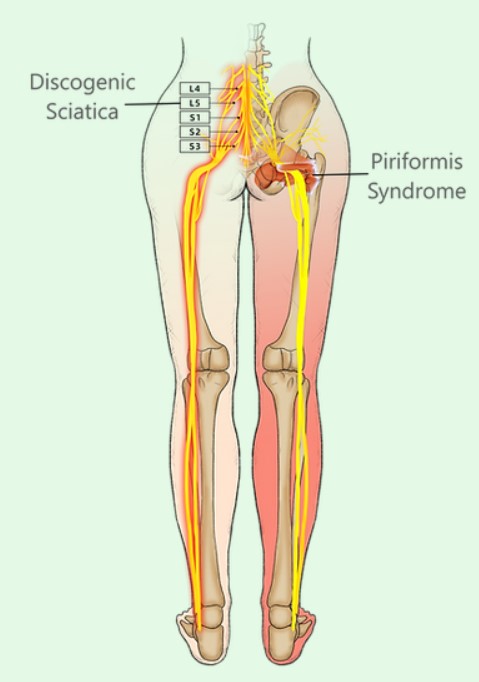 Een gespannen bilspier die de ischiadicus zenuw (vanuit de lage rug) afknelt.